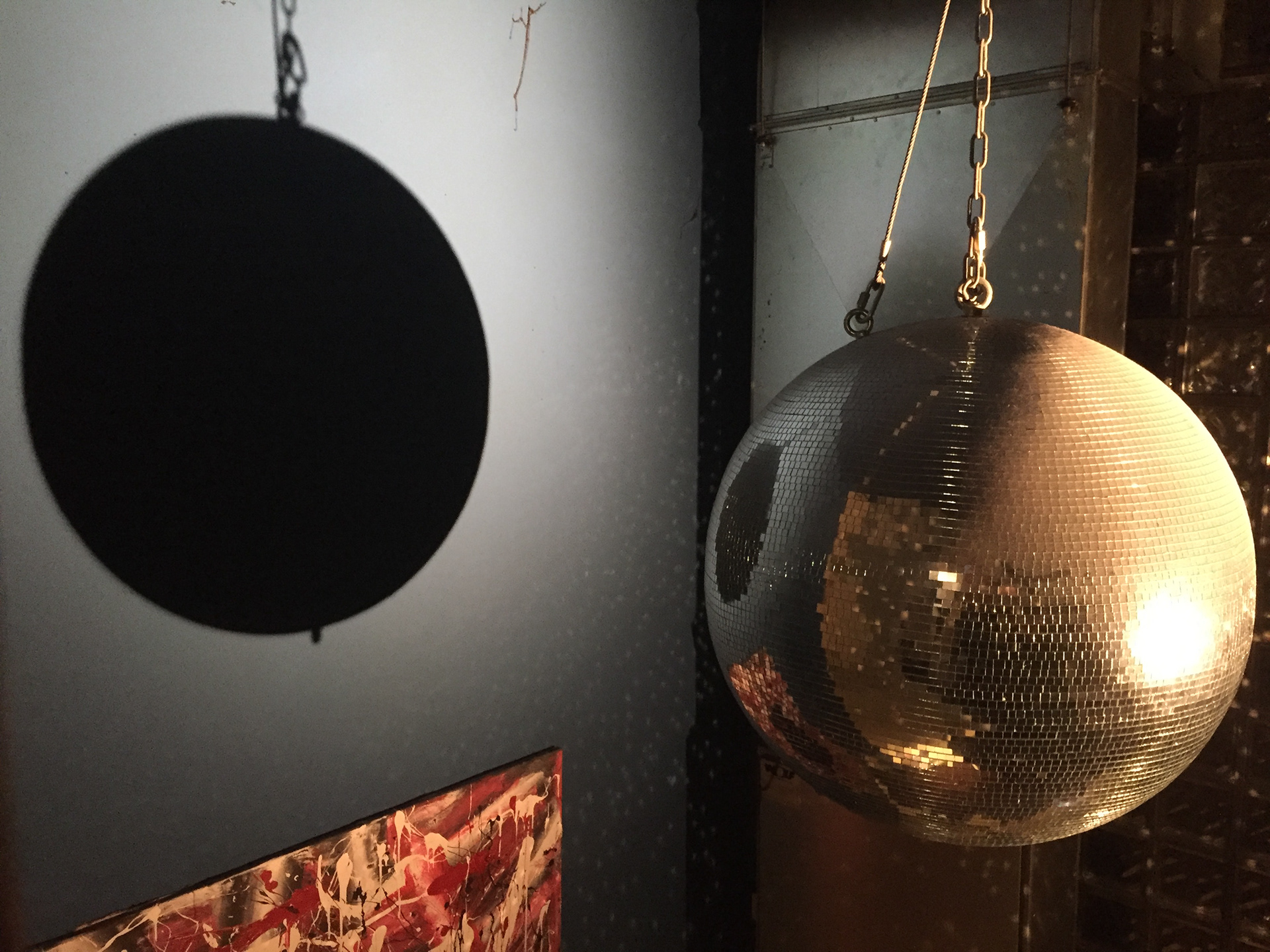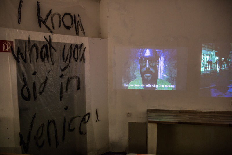 The material solution that we come up with to make this vision had to be easy to remove so the place can be rented afterwards faster and we also needed find a budget friendly solution because of the big two floor space and the information we had to spread all over. So we took basic transparent plastic sheets people often use in rainy days in Venice because of the rising sea. This kind of sheets also commonly used in popular culture to reference serial killers. Therefore the combination of this cheap plastic, black paint and the light design created the mysterious atmosphere that we wanted to reach.